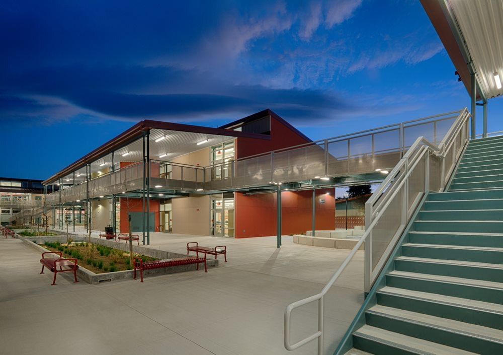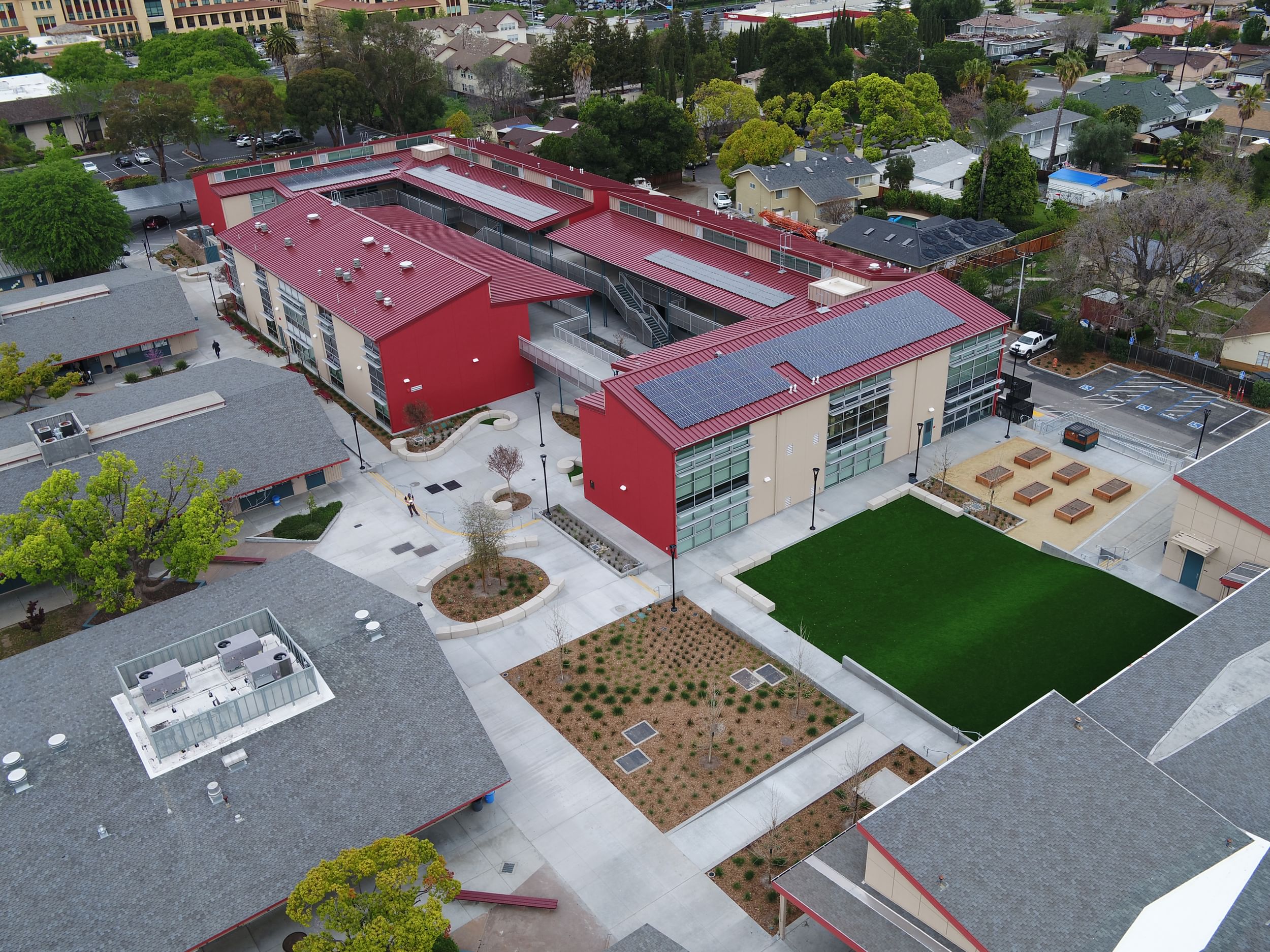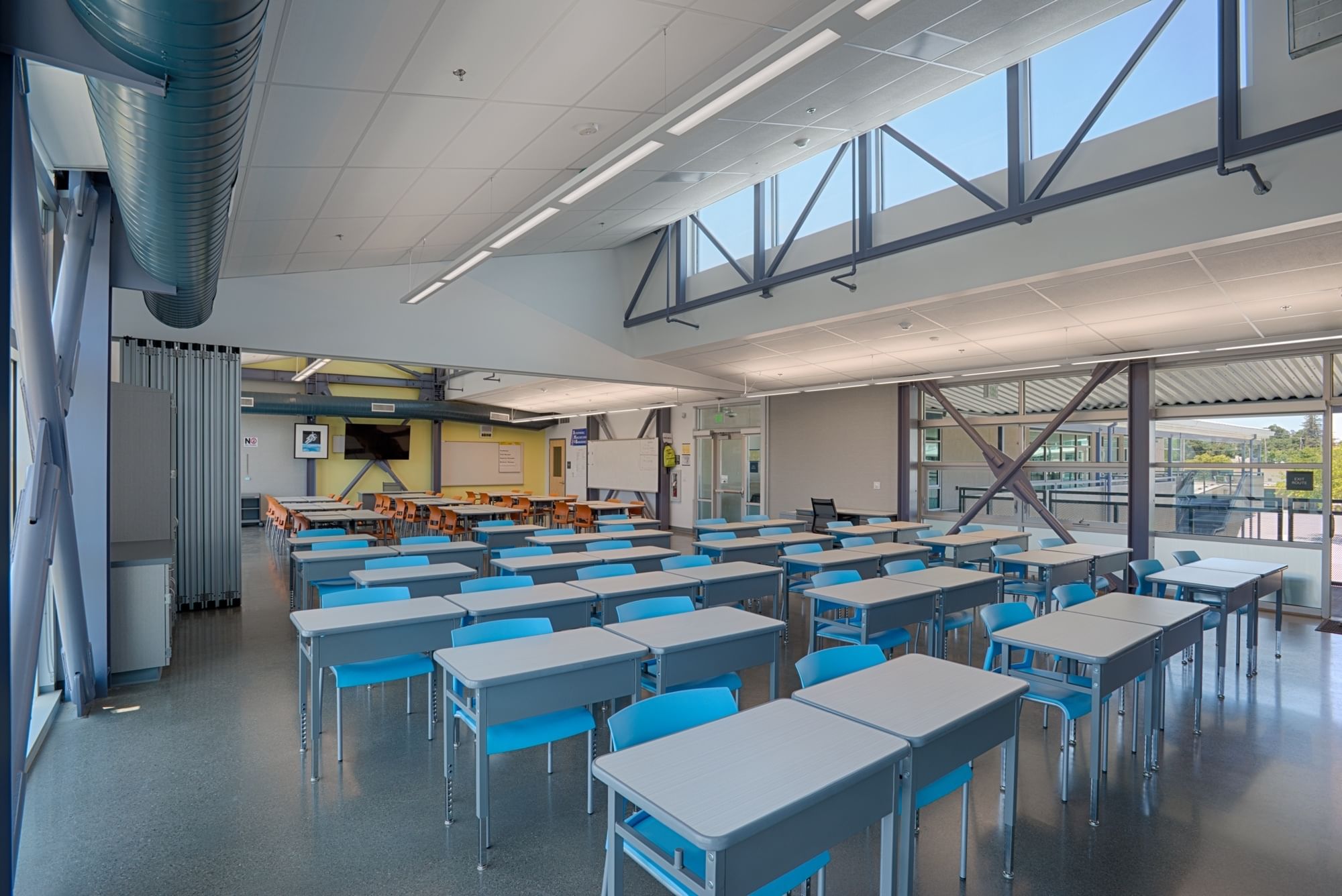 The project included a pair of two-story, L-shaped Folia classroom buildings and one two-story custom science lab building. Together, the buildings include 22 classrooms, a Career Technical Education Lab and six state-of-the-art science classrooms, all connected via balconies and arranged around an outdoor courtyard, ideal for additional collaboration space. Sustainably designed, these buildings feature ample daylighting, high-efficiency mechanical systems, environmentally responsive materials and recycled solar photovoltaic panels from another part of campus.