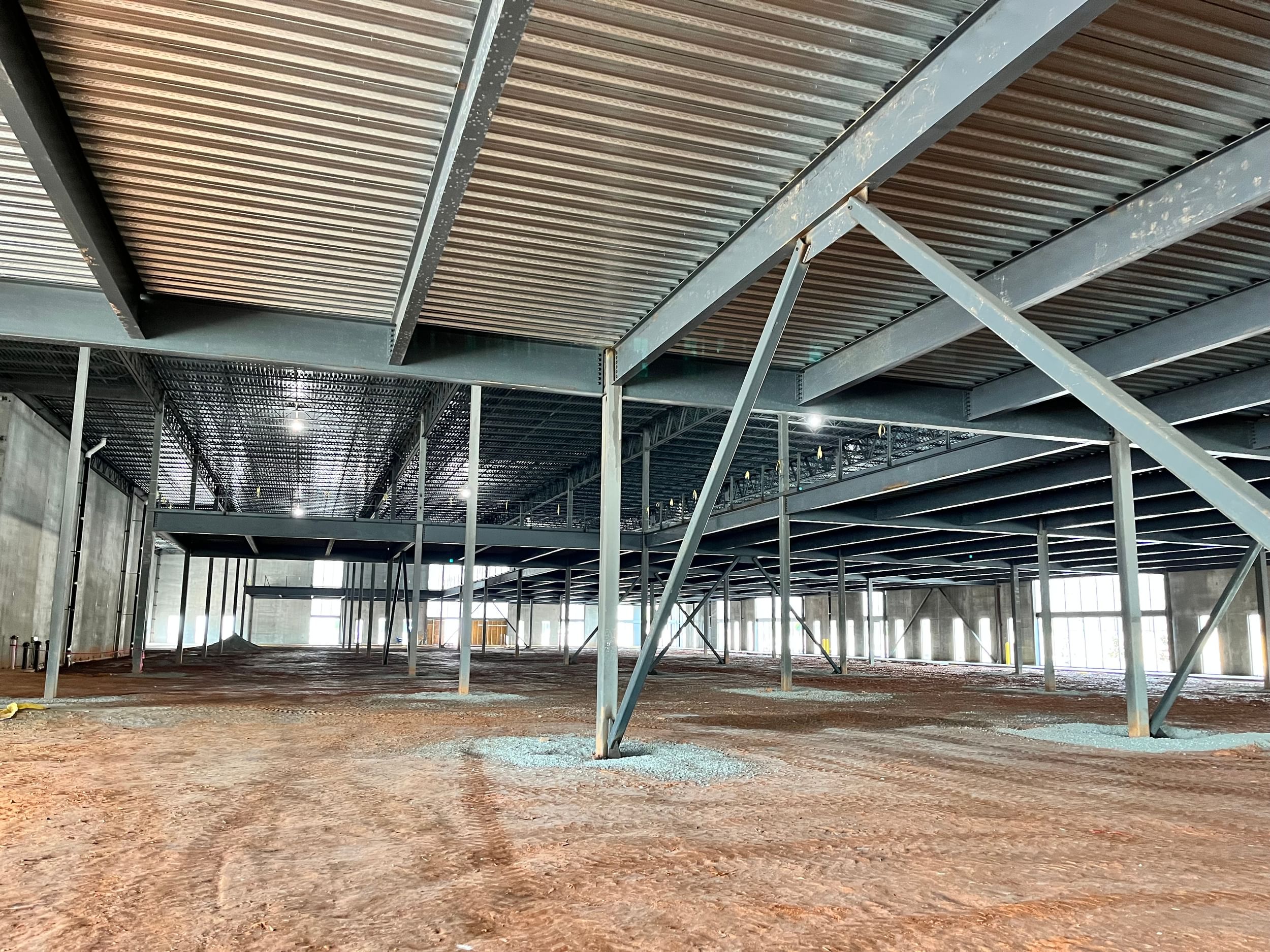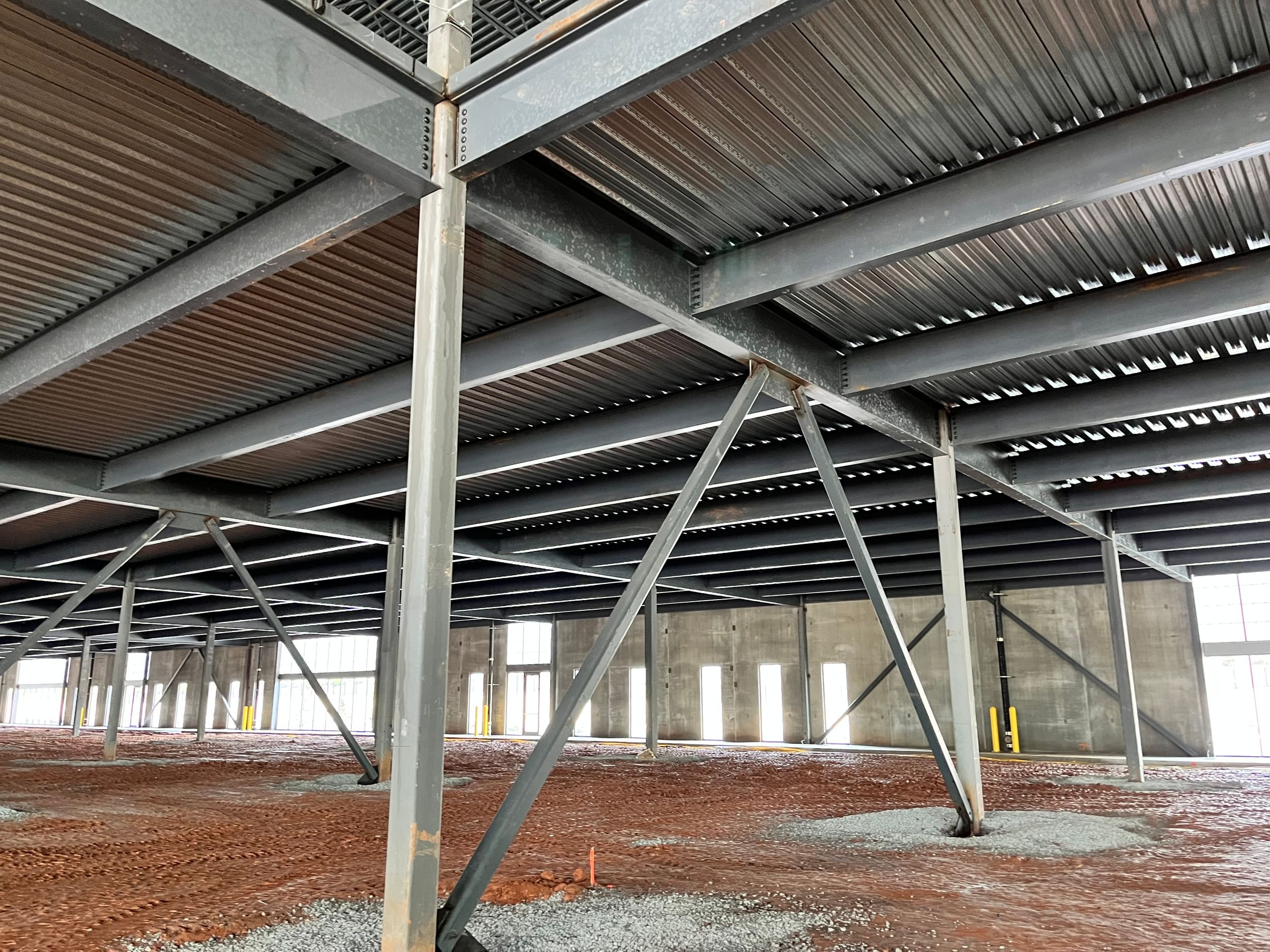 GPLA got involved in the project in the early 2020s, after another design and construction team had completed core and shell design and was nearing start of construction on Buildings A and B on the campus. DPR Construction was contracted to build out the biomanufacturing process spaces for GeneSuites and asked GPLA to conduct an independent peer review of the structural engineering plan for the building shells (two rather conventional single-story structures comprising concrete exterior walls, structural steel columns and steel bar joists and girder roof structures). Additionally, they asked GPLA to propose a cost effective, schedule-friendly engineering solution to add approximately 100,000 sq. ft. of mezzanines into the structures.